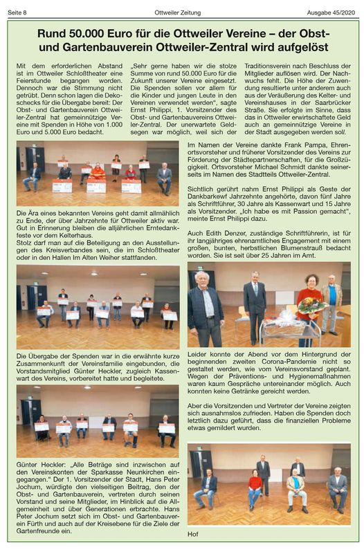 Der Förderverein erhielt am 30.10.2020 eine Spende in Höhe von 1500€ durch den Städt. Obst- und Gartenbauverein Ottweiler. Leider hatte diese Spende den traurigen Hintergrund, dass sich der Verein aufgrund fehlender Mitglieder aus dem Nachwuchsbereich auflösen musste. 🙁